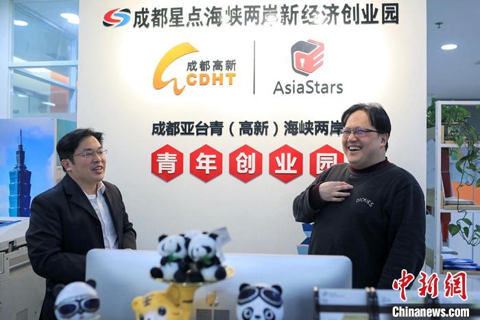 图为2月23日,四川成都,郭弘扬(左)与小象赋能(成都)科技有限公司总经理、台青李永强交谈。 中新社记者 王磊 摄
