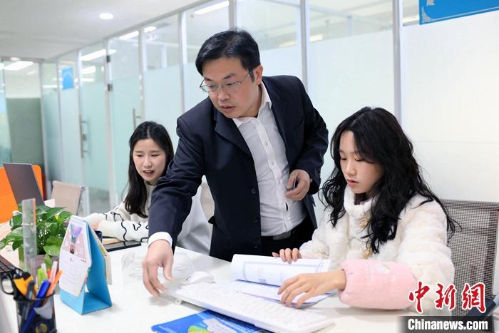 图为2月23日,四川成都,郭弘扬(中)与同事一起查看资料。 中新社记者 王磊 摄