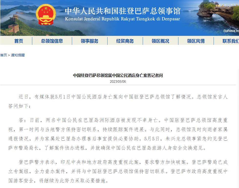 中新网5月6日电 据中国驻登巴萨总领馆网站5月6日消息,近日,有媒体就5月1日中国公民酒店身亡案向中国驻登巴萨总领馆了解情况。总领馆发言人答问如下: