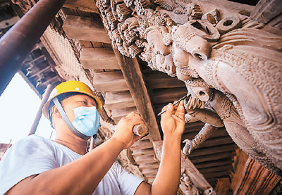 2022年,在国家文物局的指导下,中国文化遗产研究院援助尼泊尔工作队经过近5年努力,圆满完成尼泊尔加德满都杜巴广场九层神庙建筑群文物本体维修。图为2022年7月,工人在尼泊尔加德满都进行九层神庙建筑群修复工作。