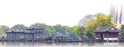 浙江杭州西湖景色优美,游人如织。
