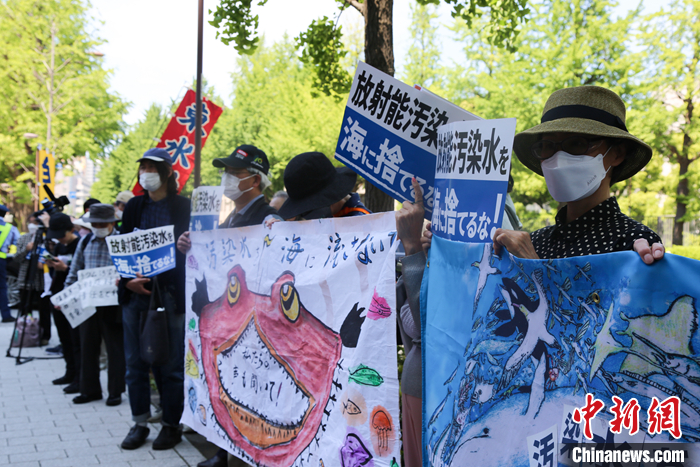 5月16日,日本民众在东京电力公司总部前举行集会,表达对日本政府和东京电力公司持续强推福岛核污染水排海计划的强烈反对。 中新社发 蒋文月 摄