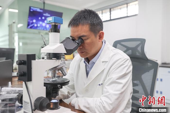 图为2023年6月19日,景德镇古陶瓷基因库实验室内,景德镇御窑博物院院长翁彦俊使用电子显微镜在观察古陶瓷标本。 中新社记者 刘力鑫 摄