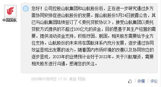 对于上述收购,中国国航于7月5日在投资者互动平台回应称,公司控股山航集团和山航股份后,正在进一步研究通过多方面协同安排促进山航股份的发展。
