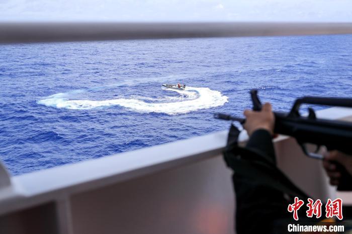 两发红色信号弹升空,一声长汽笛响彻海域。指挥所通过16国际频道用英语向高速接近的“海盗艇”发出警告:“你迅速离开,否则后果自负。”随船取证人员全程照相、录像取证。
