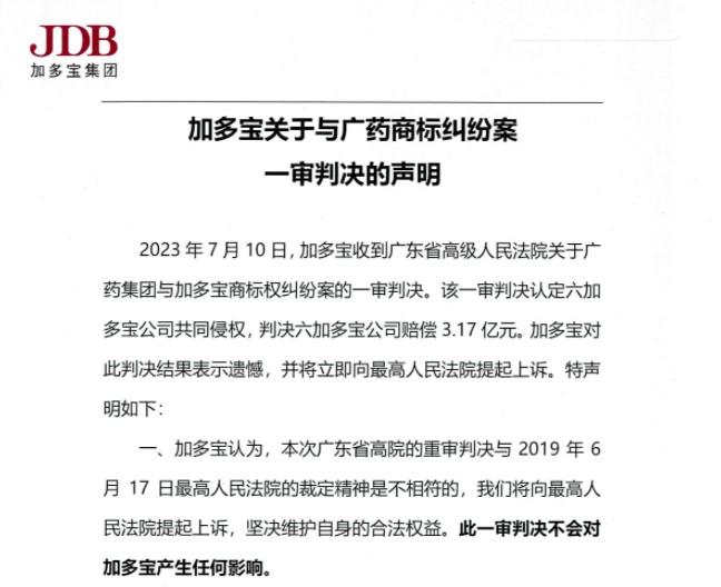 7月10日,加多宝发布《加多宝关于与广药商标纠纷案一审判决的声明》,称当天收到广东省高级人民法院关于广药集团与加多宝商标权纠纷案的一审判决。该一审判决认定六加多宝公司共同侵权,判决六加多宝公司赔偿3.17亿元。