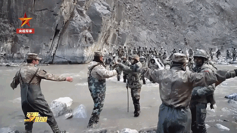 2022年9月5日,四川甘孜州泸定县发生6.8级地震,磨西镇与青岗坪交汇处,湍急的流水拦住去路。甘孜特警队员们用身体和绳索搭建桥梁,徒手爬绳索前往对岸救援。图片来源:央视新闻视频截图