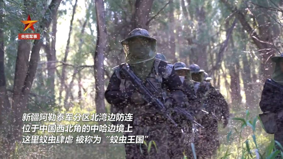新疆阿勒泰军分区北湾边防战士穿行蚊子群巡逻。一路上数以万计的蚊子、蠓虫扑面而来。图片来源:央视军事视频截图