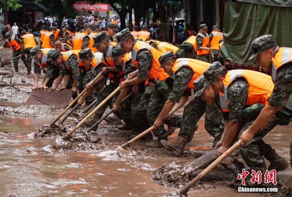 2023年7月4日,重庆市万州区五桥河河水猛涨,武警重庆总队执勤第三支队官兵在清理街道淤泥。