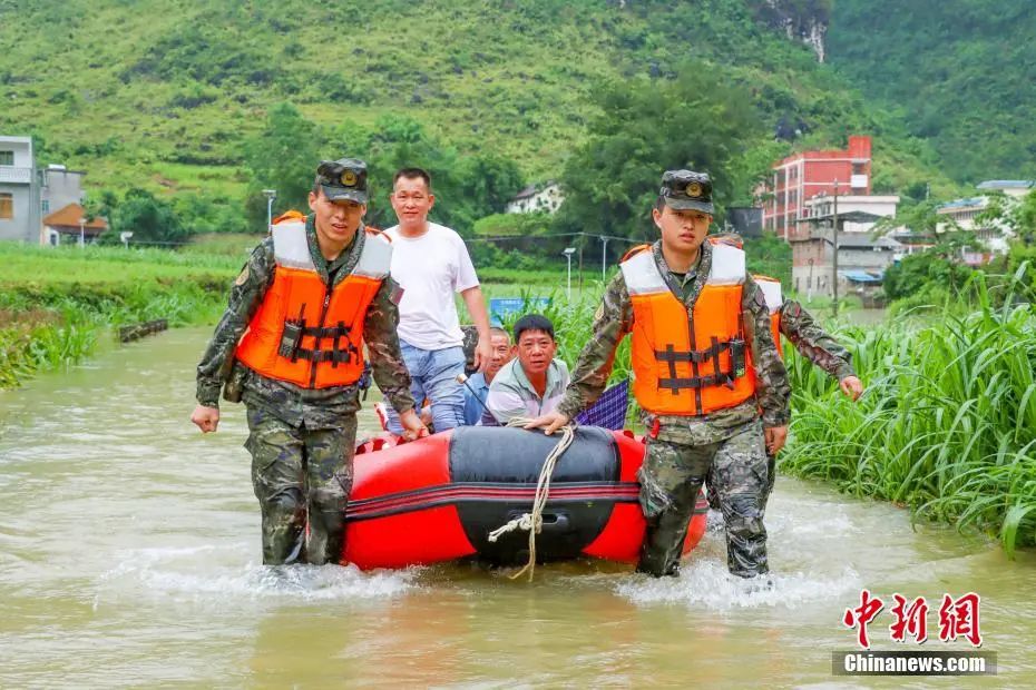 2023年6月24日,广西河池市都安县拉烈镇三表村临近河床水位上涨河水倒灌、山洪暴发,部分村民被洪水围困。武警官兵利用橡皮艇转移受灾民众。