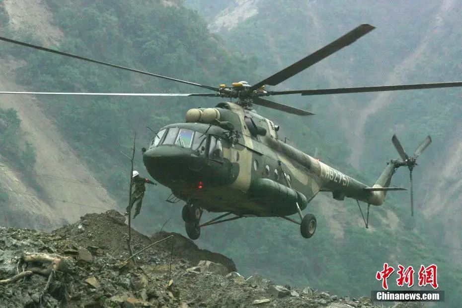 2008年5月20日,成都军区陆航团姜广伟王牌直升机组上午十时以单轮首次成功强降北川重灾区“定时炸弹”——堰塞湖无名塌方小土堆上。中新社记者 贾国荣 摄