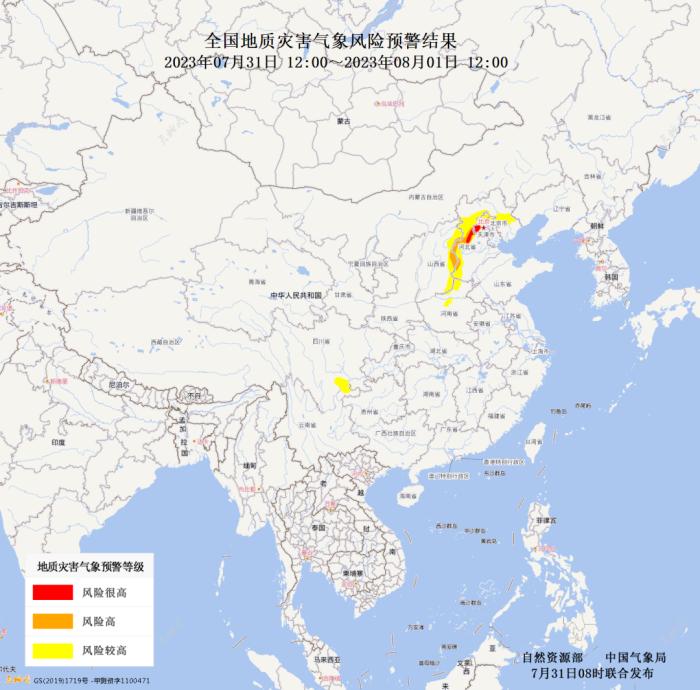 7月31日12时至8月1日12时,北京西部和北部、天津北部局部、河北西部和东北局部、山西东部、河南北部局部、四川东南局部、云南东北局部发生地质灾害的风险较高(黄色预警);