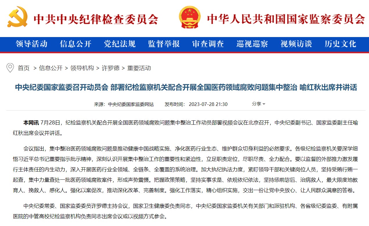 7月21日,国家卫生健康委会同教育部、公安部、审计署、国务院国资委、市场监管总局、国家医保局、国家中医药局、国家疾控局、国家药监局,十个部门联合召开视频会议,部署开展为期1年的全国医药领域腐败问题集中整治工作。