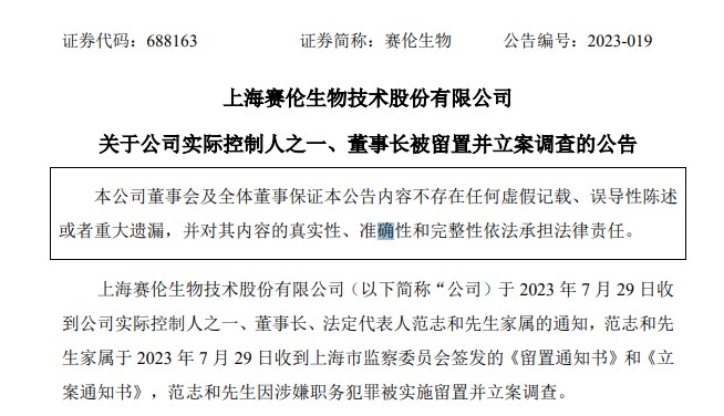 公告称,赛伦生物实际控制人之一、董事长、法定代表人范志和于2023年7月29日收到上海市监察委员会签发的《留置通知书》和《立案通知书》,范志和因涉嫌职务犯罪被实施留置并立案调查。