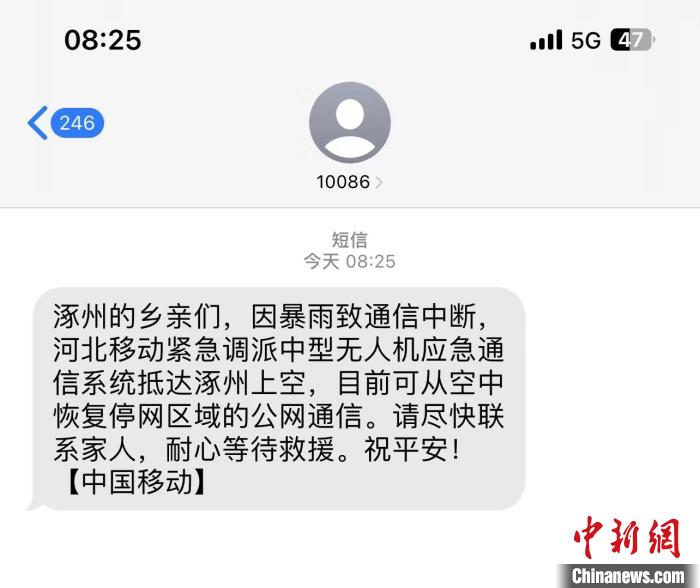 中新网石家庄8月3日电 (郝烨 赵景科)“【中国移动】涿州的乡亲们,因暴雨致通信中断,河北移动紧急调派中型无人机应急通信系统抵达涿州上空,目前可从空中恢复停网区域的公网通信。请尽快联系家人,耐心等待救援。祝平安!”8月3日早,河北涿州灾区的群众收到一条来自空中的短信。