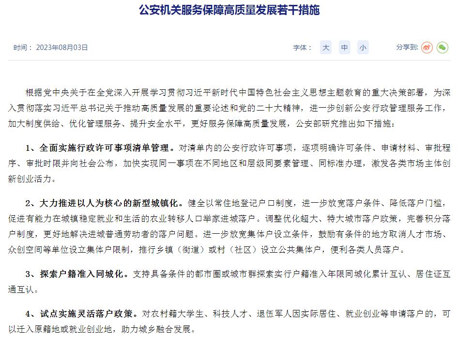 8月3日,公安部发布公安机关服务保障高质量发展若干措施,其中在户籍政策方面提出一系列举措。