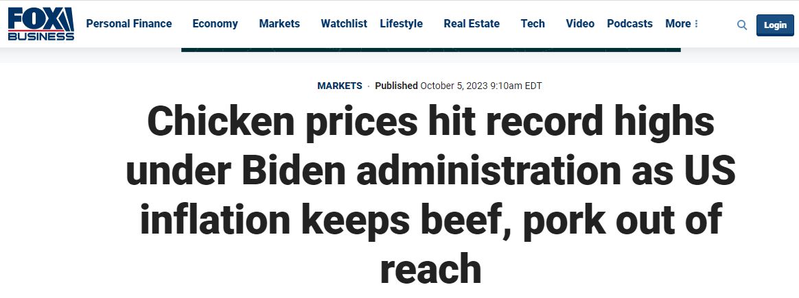 另据美国福克斯商业频道(Fox Business)网站报道,受到持续通货膨胀影响,美国牛肉和猪肉价格保持高位,普通消费者不得不转向略微便宜一些的鸡肉。然而,全美零售店的鸡肉价格也随着需求量的增加而水涨船高,更是创下历史新高,并且预计还将保持在高位。