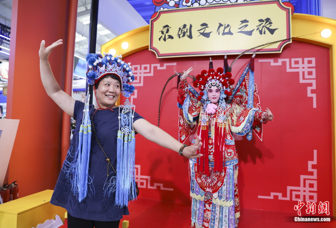 2023年中国国际服务贸易交易会(服贸会)在北京举行,观众在首钢园区“京剧文化之旅”展台模仿京剧演员表演《穆桂英》片段。赵隽 摄