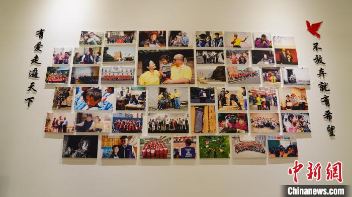 在秦荣华家中的墙上,挂着他过去30多年来在大陆各地走访、参与公益、推动两岸交流的照片。 中新社记者 杨程晨 摄