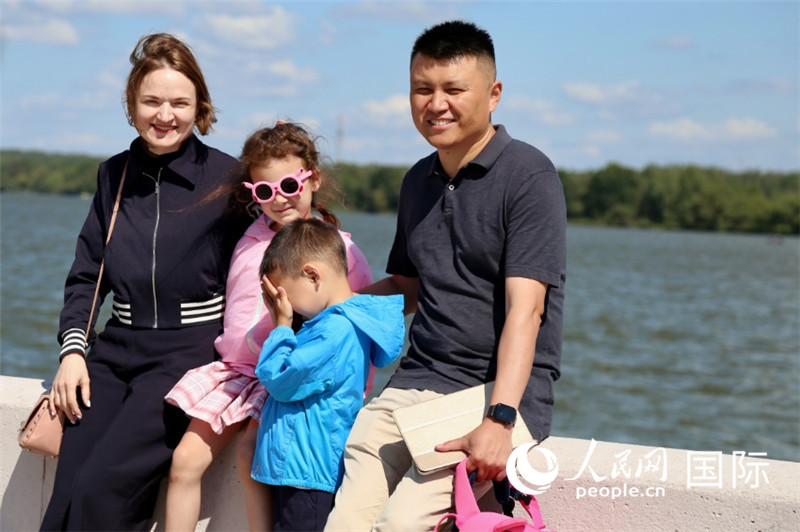 邢亮与妻子娜斯佳还有孩子们在湖边散步。人民网记者 朱虹摄