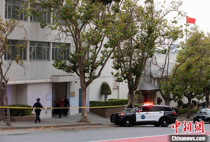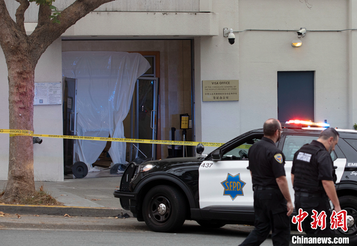 当地时间10月9日,美国旧金山警方在中国驻旧金山总领馆附近对总领馆馆舍遭冲闯袭击事件展开调查。中国驻旧金山总领馆发言人表示,9日下午,有不明身份人员驾车暴力冲撞闯入中国驻旧金山总领馆证件大厅,对工作人员及现场民众生命安全构成严重威胁,对总领馆设施与财产造成严重破坏,性质极其恶劣。 中新社记者 刘关关 摄