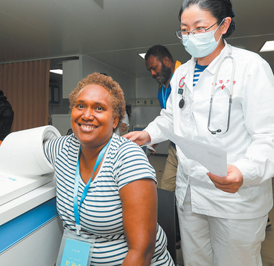 8月21日,中国海军“和平方舟”号医院船首次对所罗门群岛进行访问。图为前来就诊的当地民众在医院船上进行血压检测。