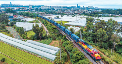 “沪滇·澜湄线”国际货运班列开行首发仪式近日在云南省昆明市王家营西集装箱中心站举行。满载来自东南亚地区的水果、橡胶和白糖、金属硅等产品的班列,驶向上海临港新片区芦潮港站。图为“沪滇·澜湄线”国际货运班列驶出王家营西集装箱中心站。