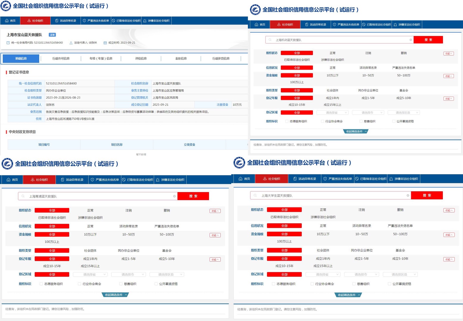 中新网查询全国社会组织信用信息公示平台发现,上海市宝山蓝天救援队成立登记日期为2023年9月21日,系民办非企业单位,业务主管单位为上海市宝山区应急管理局。其余3个组织显示为“该组织未在民政部门登记,请您注意风险,加强防范”。