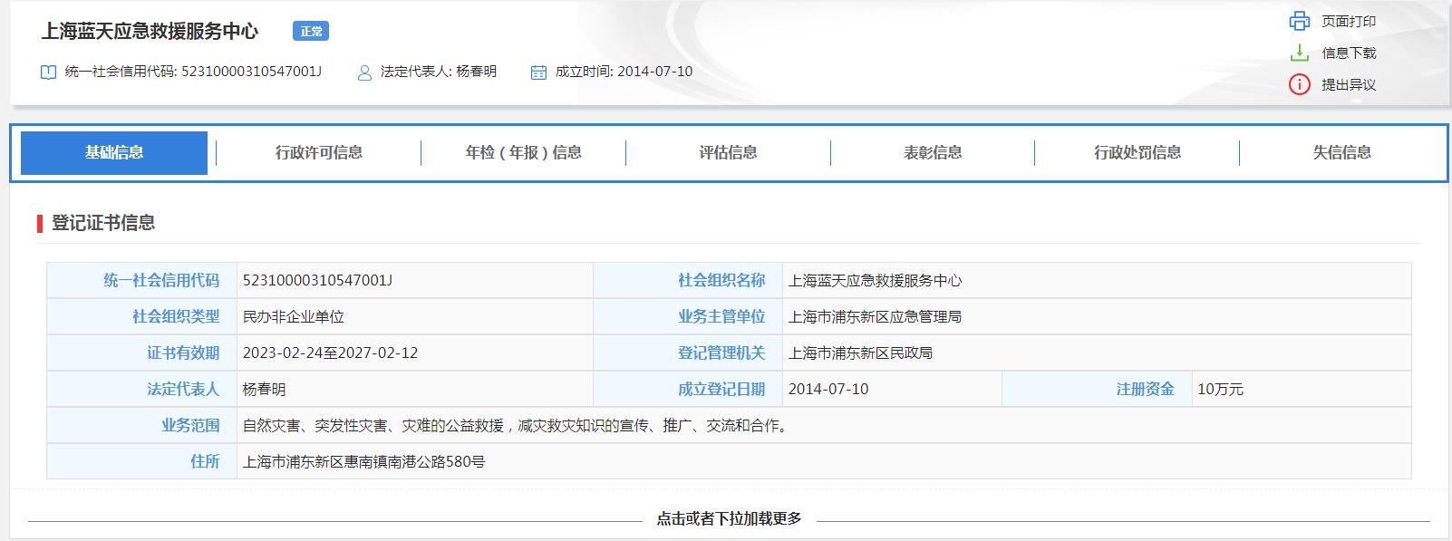 企查查信息显示,上海蓝天应急救援服务中心成立于2014年,法人为杨春明。全国社会组织信用信息公示平台显示,其成立登记日期为2014年7月10日,系民办非企业单位,登记管理机关为上海市浦东新区民政局。
