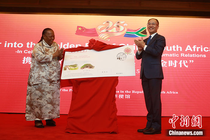 当地时间12月12日,中国驻南非大使馆隆重举行庆祝中国和南非建交25周年招待会。图为中国驻南非大使陈晓东同南非外长潘多尔为中南建交25周年纪念封揭幕。 中新社记者 王曦 摄
