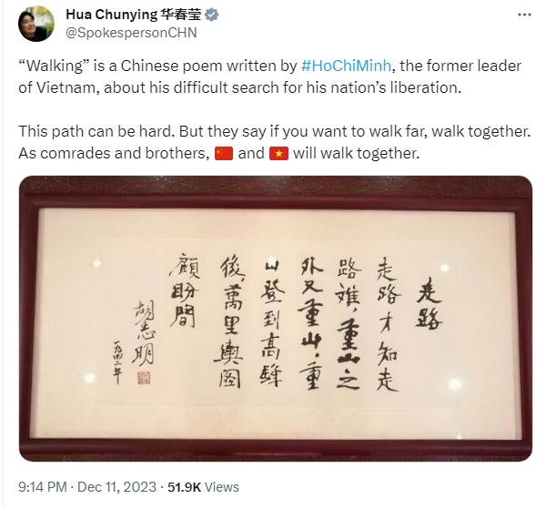 华春莹写道,“《走路》是越南老一辈领导人胡志明所写的一首汉语诗,讲述了他争取国家解放的艰难历程。这条路可能很艰难。但人们说,如果想走得远,就要一起走。作为同志和兄弟,中国和越南将一路同行。”