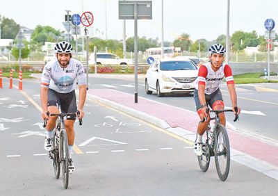 两名骑行爱好者在“迪拜骑行”活动中。