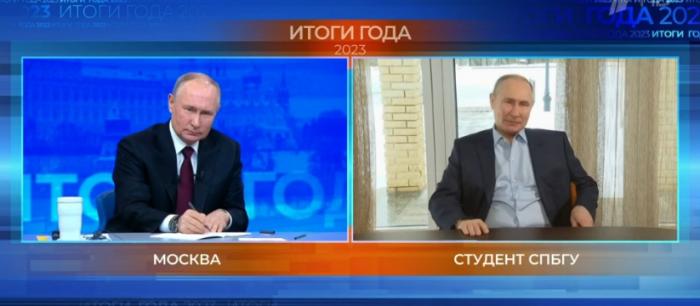 俄总统2023年年度记者会上,主持人播放了一段带有普京影像和声音的合成视频,画面左侧为普京,右侧为合成人像。图片来源:俄罗斯第一频道截图