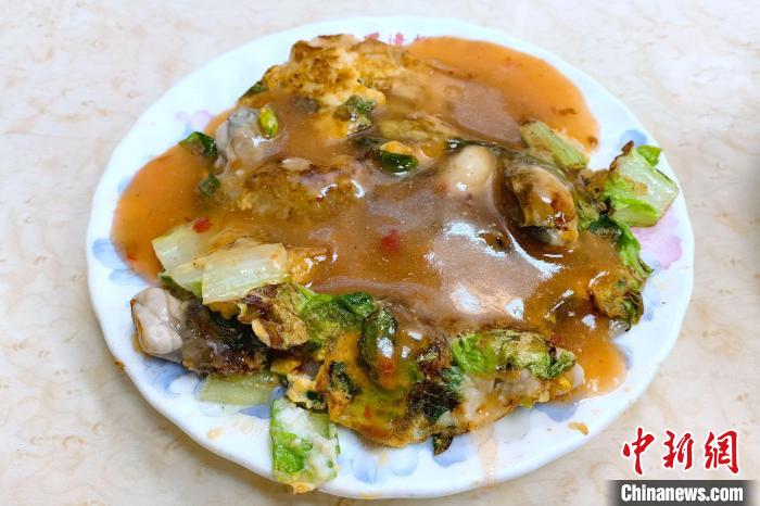 近日,台北宁夏夜市里圆环边蚵仔煎店的蚵仔煎。 中新社记者 陈小愿 摄