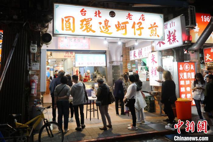 近日,台北宁夏夜市里的圆环边蚵仔煎店,顾客在门口排队。 中新社记者 陈小愿 摄
