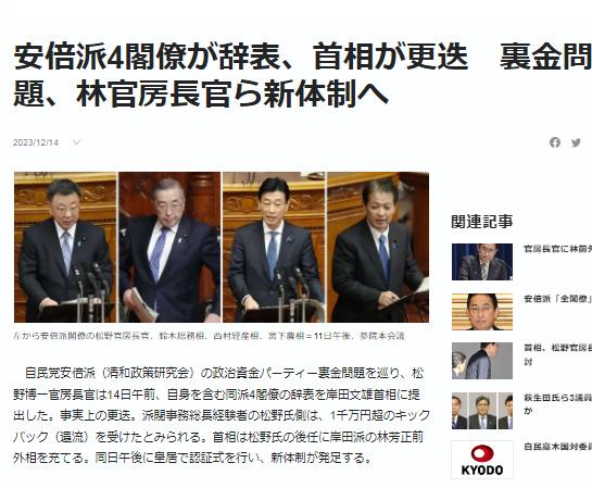 中新网12月14日电 据日本共同社报道,日本自民党安倍派“吃回扣”丑闻持续发酵,当地时间14日,多名岸田内阁官员提出辞职。