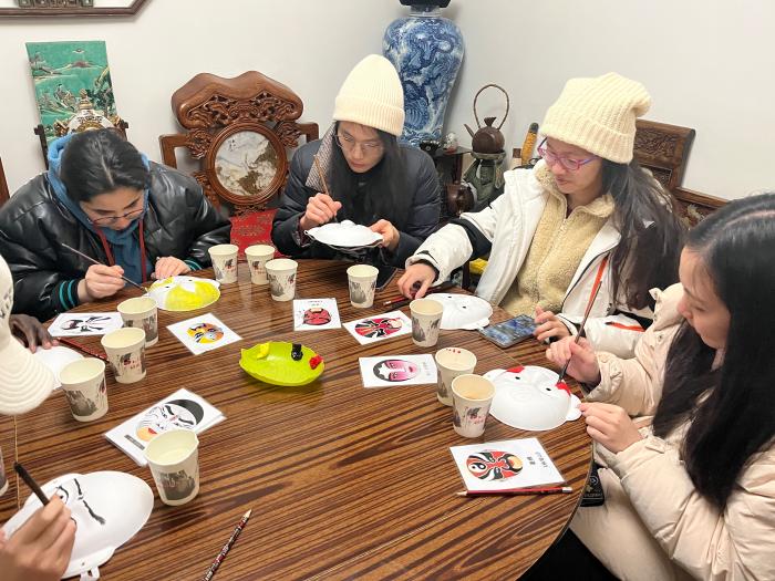 参观完天坛之后,活动的下一站是在老北京胡同里体验戏剧脸谱绘制。在了解脸谱文化的起源与发展后,留学生们纷纷对“红脸关公” “白脸曹操”感到新奇,大家迫不及待地围坐在小桌前,一笔一划地勾勒出属于自己的脸谱,一个个惟妙惟肖。