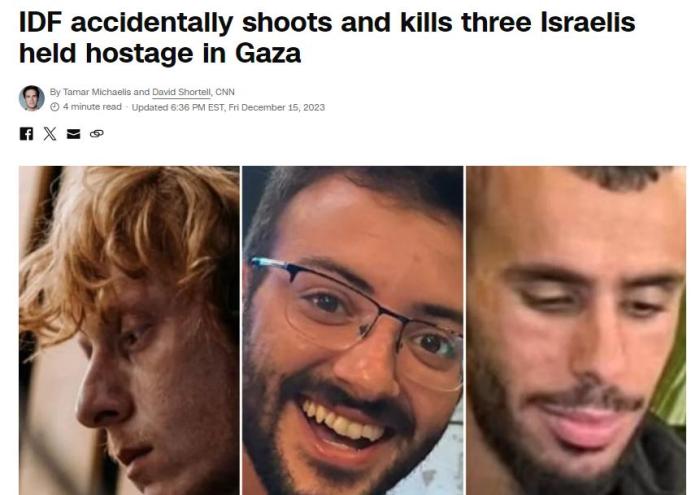 据美国有线电视新闻网(CNN)报道,以色列国防军发言人赫格里在新闻发布会上表示,“在谢贾亚的战斗中,以色列国防军错误地将三名以方人质视为威胁。军队向其开火,他们被打死。”