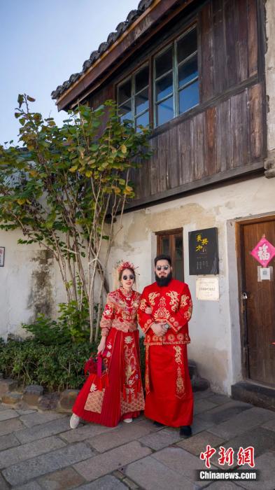 就在不久前,美莎和沙呐沙拍了中式婚纱照,身着红色秀禾服的美莎选择与先生在白墙灰瓦的中式园林建筑中留下二人爱情的见证。而两人的婚礼也颇有戏剧性,双方父母在土库曼斯坦家乡为两人办酒,没能回国的他们则通过视频远程参加了自己的婚礼,接受家人们的祝福。美莎笑称,她的微信婚礼很特别,很能代表中国速度。