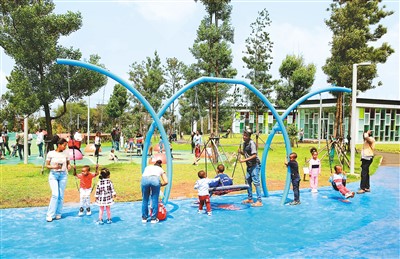 埃塞俄比亚首都亚的斯亚贝巴河岸绿色发展项目是由中国援助的工程,包括整治城市河道、在河道周边修建公园和其他公共设施等。图为当地孩子们在亚的斯亚贝巴河岸绿色发展项目的儿童乐园玩耍。
