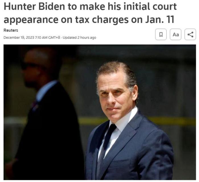 美国总统拜登儿子亨特2024年1月将就税务指控出庭