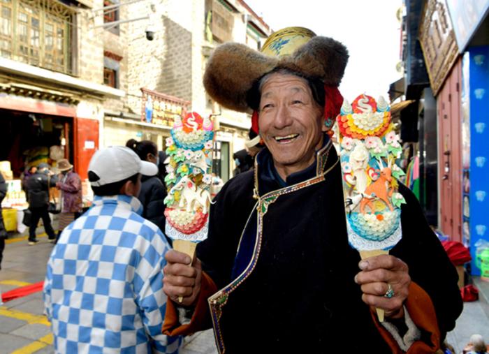 图为:藏族老大爷手里拿着五彩酥油花“孜珠” 中新社记者 李林摄
