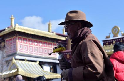 图为八廓街转经的藏族老阿爸老阿妈。中新社记者李林摄