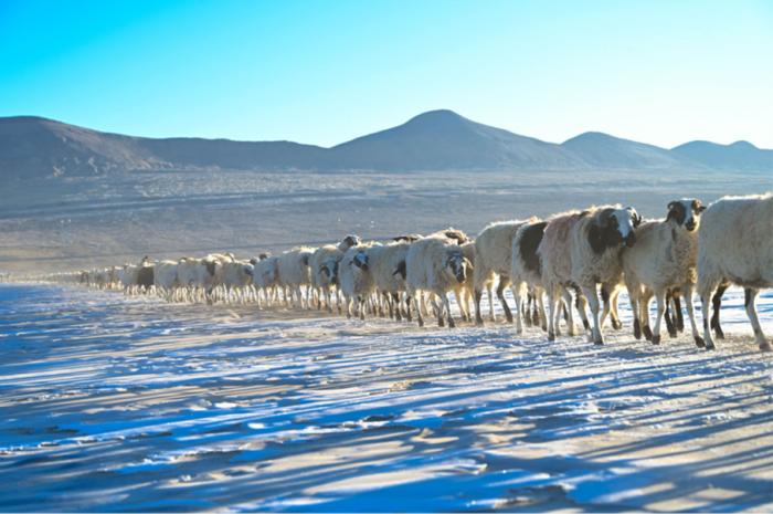 图为普莫雍错蓝冰上羊群前往湖心岛 。中新社记者 赵朗 摄