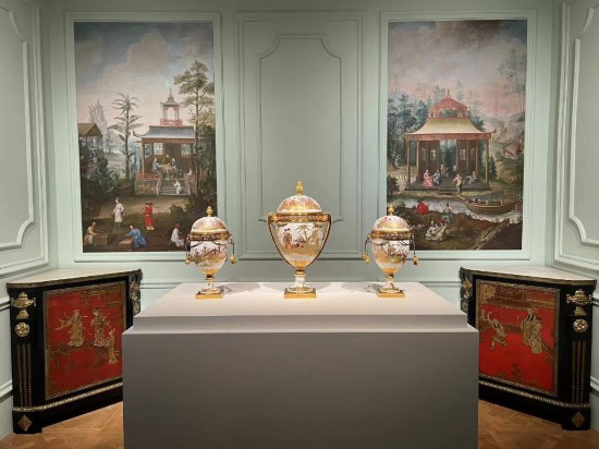 展厅正中,复刻路易十五王后玛丽·莱什琴斯卡私人房间“中国人厅”的展陈精致非常。绘制中国人物形象的法国产瓷瓶、镶嵌了中国漆版的墙角柜,正无声诉说着当年法国贵族们对中国艺术的追捧和热爱。