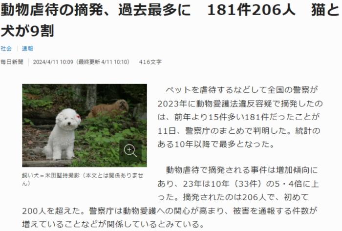 中新网4月11日电 据日本《每日新闻》报道,11日,日本警察厅发布消息称,日本警方在2023年共处理了181起虐待动物的案件,较2022年增加了9%,创下2010年开始统计以来的最高值,累计案件数量在10年间激增了5倍。