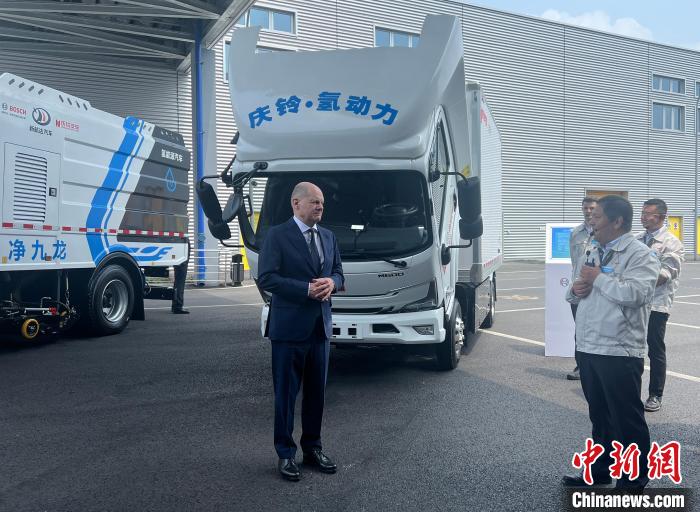 博世氢动力系统(重庆)有限公司是朔尔茨访渝首站参观地。该公司由博世与庆铃汽车合资建立,致力于将博世氢燃料电池解决方案引入中国市场。在参访点入口,四辆冷链物流、环卫及牵引车等依次停放。这些车全为中国国产汽车,使用博世氢动力系统(重庆)有限公司出产的氢动力模块。朔尔茨在企业相关负责人的介绍下,了解博世与中企合作的最新成果。在工作人员指引下,朔尔茨为完成预装的氢动力模块拴紧最后一颗螺丝,向身边工作人员竖起了大拇指。