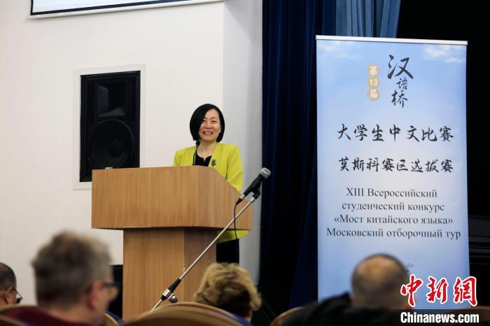4月12日,中国驻俄使馆教育处一等秘书邓滢出席第十三届全俄“汉语桥”大学生中文比赛莫斯科赛区选拔赛并致辞。(中新网记者 田冰 摄)