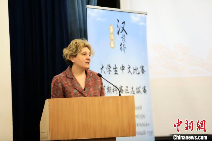 4月12日,莫斯科国立语言大学副校长古谢茵诺娃出席第十三届全俄“汉语桥”大学生中文比赛莫斯科赛区选拔赛并致辞。(中新网记者 田冰 摄)