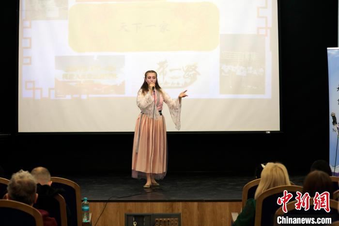 4月12日,第十三届全俄“汉语桥”大学生中文比赛莫斯科赛区选拔赛在莫斯科国立语言大学举行。图为参赛选手进行主题演讲。(中新网记者 田冰 摄)